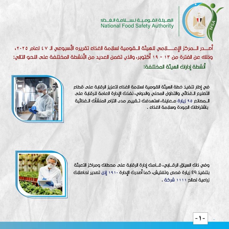 كثفت إدارات الهيئة أنشطتها الميدانية بتوجيهات من الدكتور طارق الهوبي، رئيس الهيئة، حيث نفذت إدارة الرقابة على المصانع 95 زيارة تفتيشية، وقامت إدارة المحال العامة بمعاينة 602 منشأة، كما سجلت إدارة المنشآت السياحية 32 فندقاً و12 مطعماً جديداً تزامناً مع الاستعدادات لأعياد رأس السنة، وشملت الجهود فحص 95 شكوى حكومية، وتنفيذ حملات رقابية فورية استهدفت 40 منشأة بمختلف المحافظات لضمان مطابقة المعروض لاشتراطات سلامة الغذاء.