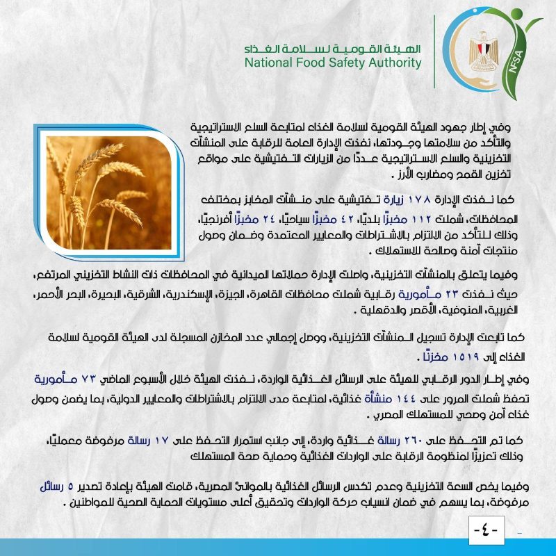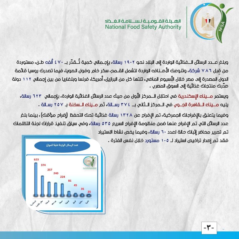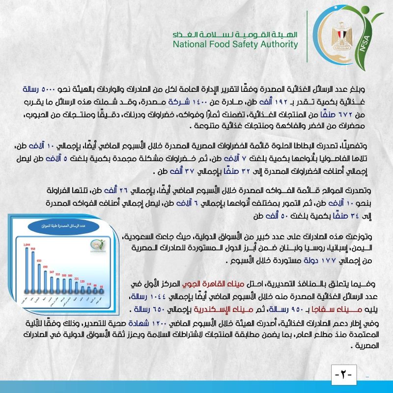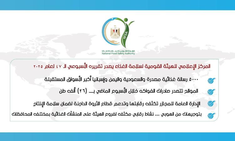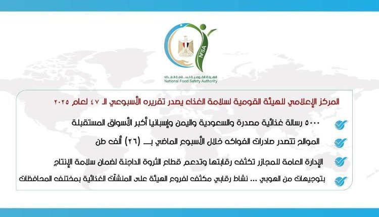 أصدر المركز الإعلامي للهيئة القومية لسلامة الغذاء تقريره الأسبوعي الـ 47 لعام 2025، كاشفا عن طفرة في الأنشطة الرقابية والتصديرية خلال الفترة من 13 إلى 19 ديسمبر الجاري، حيث نجحت مصر في تصدير نحو 5000 رسالة غذائية بحمولة بلغت 192 ألف طن إلى 177 دولة حول العالم، وجاءت المملكة العربية السعودية واليمن وإسبانيا وروسيا ولبنان على رأس قائمة الدول المستقبِلة لتلك الصادرات التي شملت 672 صنفاً من المنتجات المتنوعة.