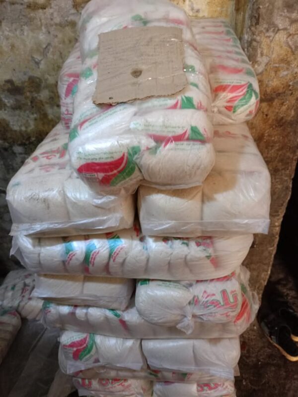 تم ضبط مخزن بداخله كميه وقدرها ١١٠٠ كجم سكر تموينى مدعم تم تجميعه بغرض اعادة بيعه بالسوق السوداء