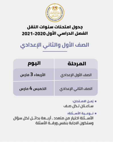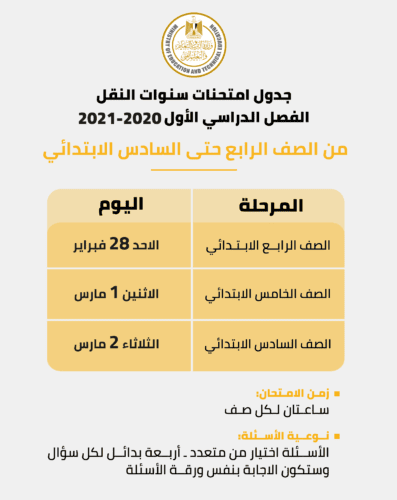 ننشر لكم من خلال موقع مصر البلد الإخبارية جدول امتحانات 2020- 2021 وضوابط النجاح والانتقال للصفوف الأعلى لسنوات النقل من الصف الرابع الابتدائي حتى الصف الثاني الإعدادي والتى تتلخص ف ال آتي: