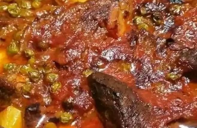 ثم نضيف البسله وتقلب مع اللحم ثم الماء الساخن وتترك تغلي حتي تتشرب كمية الماء وتقترب من النضج ونضع الطماطم والجزر والصلصه