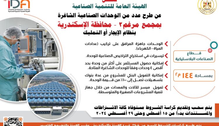 في إطار استراتيجية وزارة الصناعة وتكليفات الفريق مهندس كامل الوزير نائب رئيس مجلس الوزراء للتنمية الصناعية وزير الصناعة والنقل لتسريع وتيرة التنمية الصناعية وتعميق التصنيع المحلي ودعم سلاسل التوريد وصغار المستثمرين الجادين، تعلن الهيئة العامة للتنمية الصناعية عن طرح عدد محدود من الوحدات الصناعية الشاغرة كاملة التجهيزات والمرافق بمجمع مرغم ٢ بمحافظة الإسكندرية.