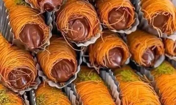 – نأخذ الكنافة كما هي بطولها حتى تلف على الأقماع.