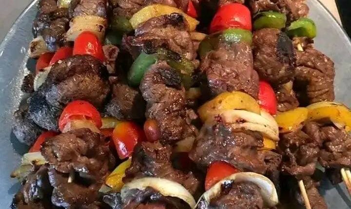 نضع الدجاج في اعواد الشواء مع قطع فلفل رومي و قطع بصل و قطع طماطم ..
