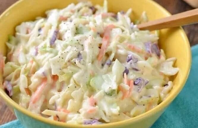 غطي الوعاء جيداً و ضعيه في الثلاجة لمدة ساعة علي الأقل . و يفضل تقليب سلطة الكول سلو قبل تقديمها