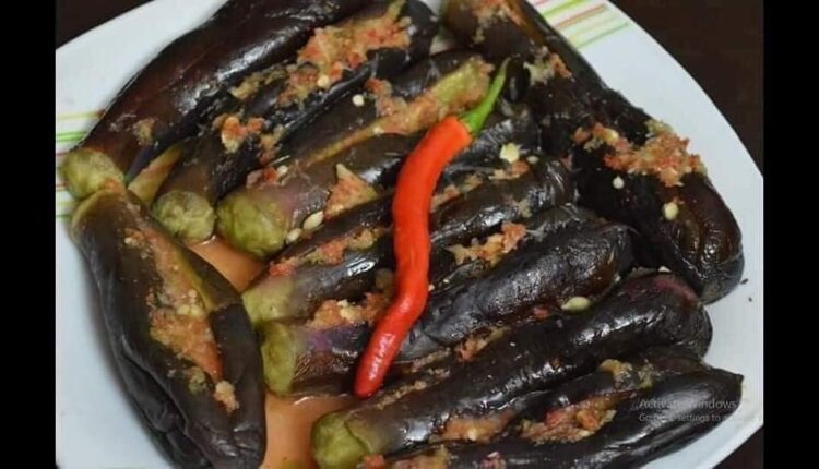 3. اصنعي شق بواسطة سكين حادة في حبات الباذنجان واحشي الباذنجان بحشوة الفلفل.