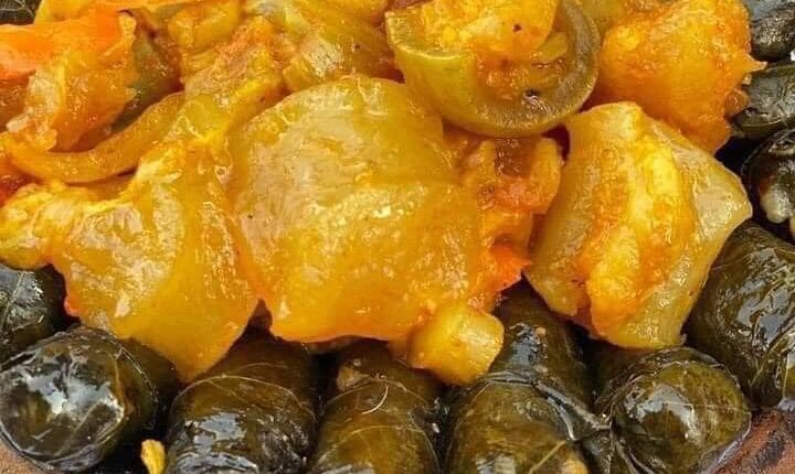 – تُوضع مكعبات الكوارع بين راقات ورق العنب المحشي وتُوضع قطعة كوارع بالعظم في المنتصف بحيث يحيطها أصابع ورق العنب من كل الجهات.