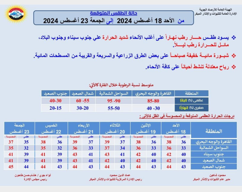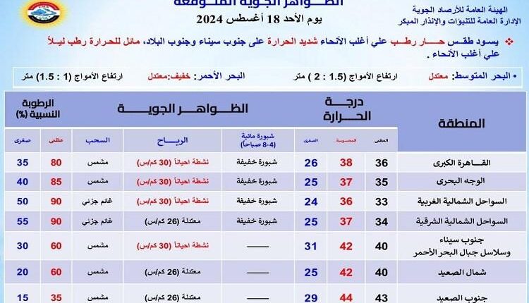 يتوقع خبراء هيئة الأرصاد الجوية أن يسود غدا /الأحد/ طقس حار رطب نهارا على القاهرة الكبرى والوجه البحري والسواحل الشمالية شديد الحرارة على جنوب سيناء وجنوب البلاد، بينما يسود طقس مائل للحرارة رطب ليلا على أغلب الأنحاء معتدل الحرارة رطب على السواحل الشمالية.