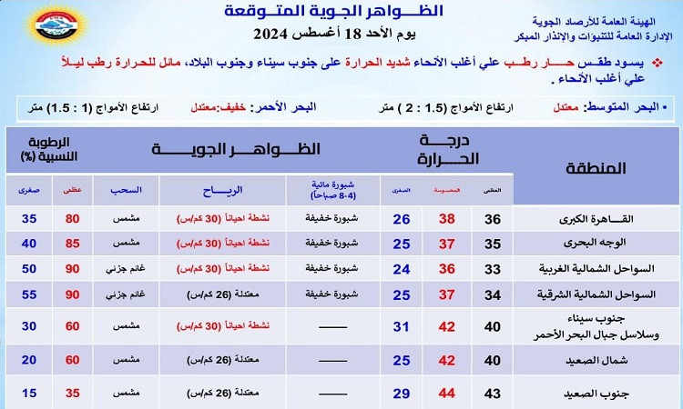 وبالنسبة لحالة البحر المتوسط تكون معتدلة وارتفاع الموج من 1.5 متر إلى مترين والرياح شمالية غربية. وبالنسبة لحالة البحر الأحمر تكون خفيفة إلى معتدلة وارتفاع الموج من متر إلى 1.5 متر والرياح شمالية غربية.