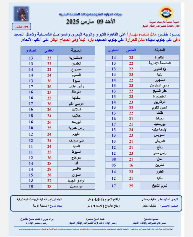 وأضاف الخبراء أنه بالنسبة لحالة البحرالمتوسط خفيف وارتفاع الموج من 0.75 متر الى 1.25 متر واتجاة الرياح شمالية غربية الى شمالية شرقية وبالنسبة لحالة البحرالأحمر خفيف إلى معتدل وارتفاع الموج من المتر إلى متر ونصف واتجاه الرياح شمالية غربية .