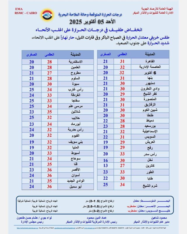 وفيما يلي بيان بدرجات الحرارة المتوقعة اليوم على مدن ومحافظات مصر: