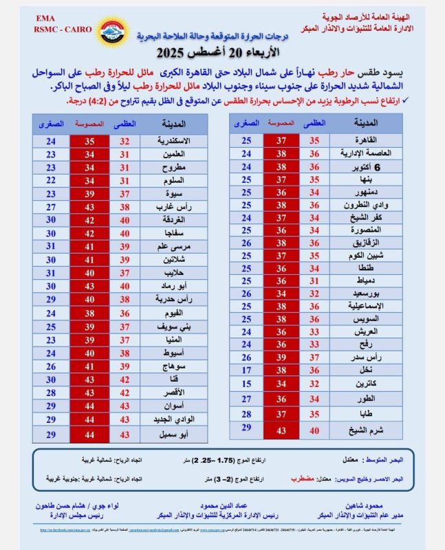 تتوقع هيئة الأرصاد الجوية أن يسود، اليوم الأربعاء، طقس حار رطب نهارا على القاهرة الكبرى والوجه البحري والسواحل الشمالية، شديد الحرارة على جنوب سيناء وجنوب البلاد.. بينما يسود طقس مائل للحرارة رطب ليلا على أغلب الأنحاء.