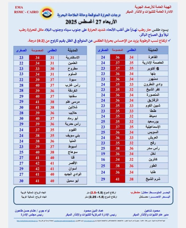 وفيما يلي بيان بدرجات الحرارة المتوقعة اليوم على محافظات ومدن مصر