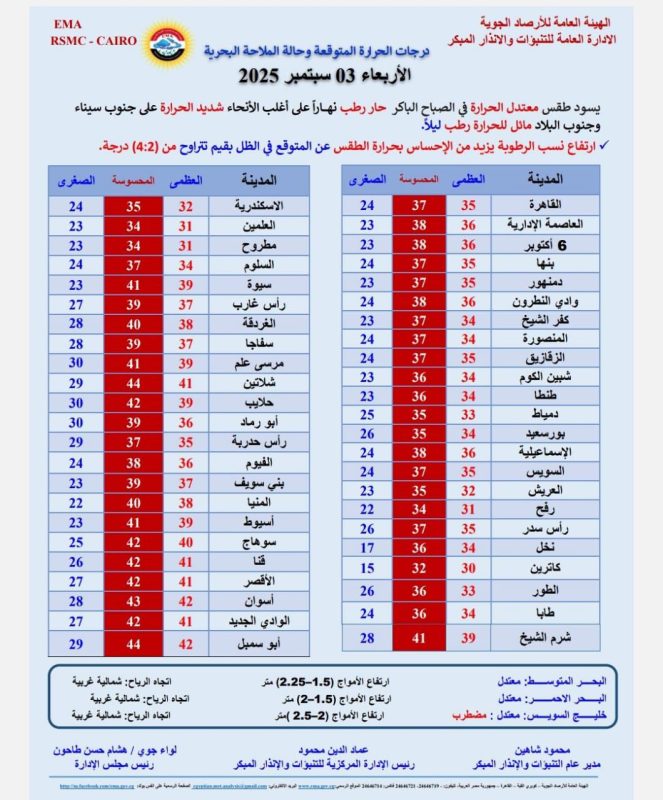 تتوقع هيئة الأرصاد الجوية أن يسود البلاد، اليوم الأربعاء، طقس حار رطب نهارا على القاهرة الكبرى والوجه البحرى والسواحل الشمالية، شديد الحرارة على جنوب سيناء وجنوب البلاد، فيما يسود ليلا طقس مائل للحرارة رطب على أغلب الأنحاء.
