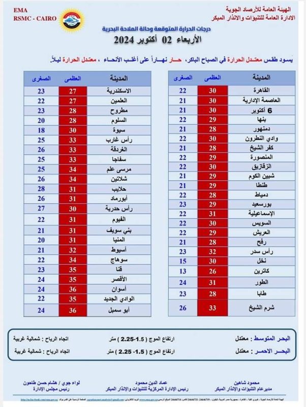 فيما يلي درجات الحرارة المتوقعة، اليوم الأربعاء، العظمى والصغري:-