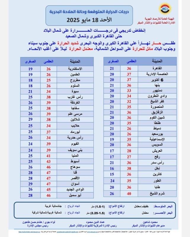 وفيما يلي بيان بدرجات الحرارة المتوقعة اليوم على محافظات ومدن مصر:-