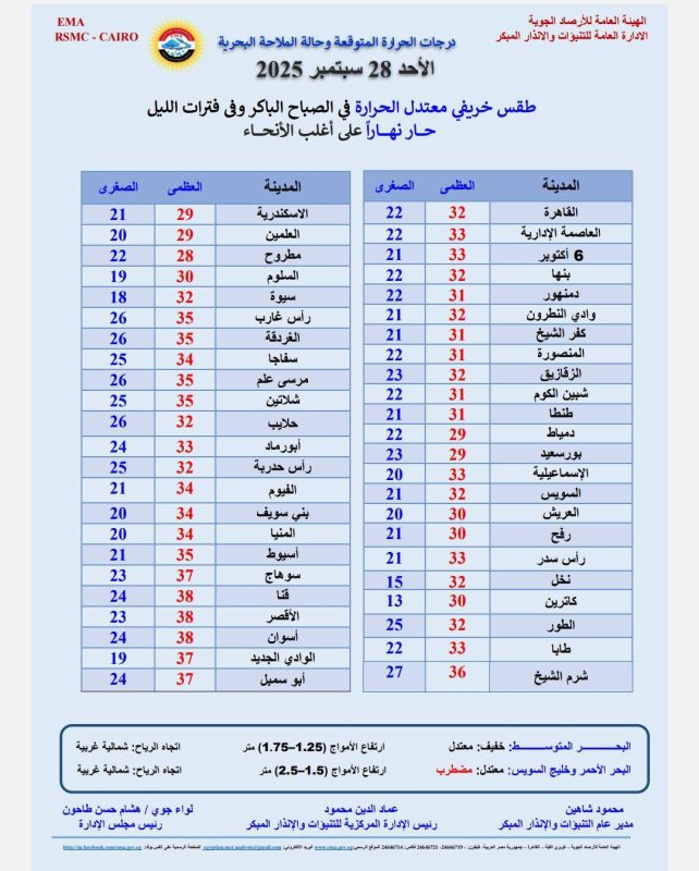 وفيما يلي بيان بدرجات الحرارة المتوقعة العظمى والصغرى اليوم على مدن ومحافظات مصر: