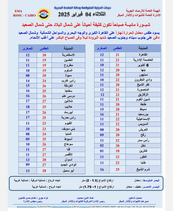 وفيما يلي بيان بدرجات الحرارة المتوقعة اليوم على مدن ومحافظات مصر:-