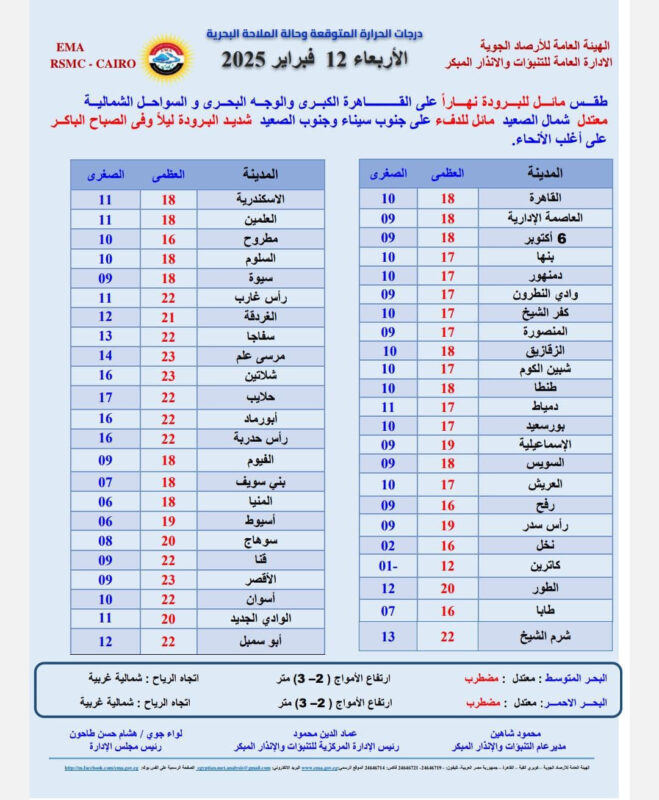 وفيما يلي بيان بدرجات الحرارة المتوقعة اليوم على محافظات ومدن مصر:-
