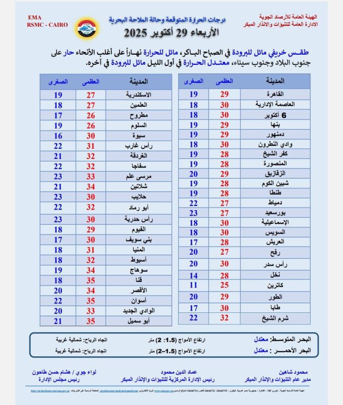 وفيما يلي بيان بدرجات الحرارة المتوقعة اليوم على محافظات ومدن مصر: