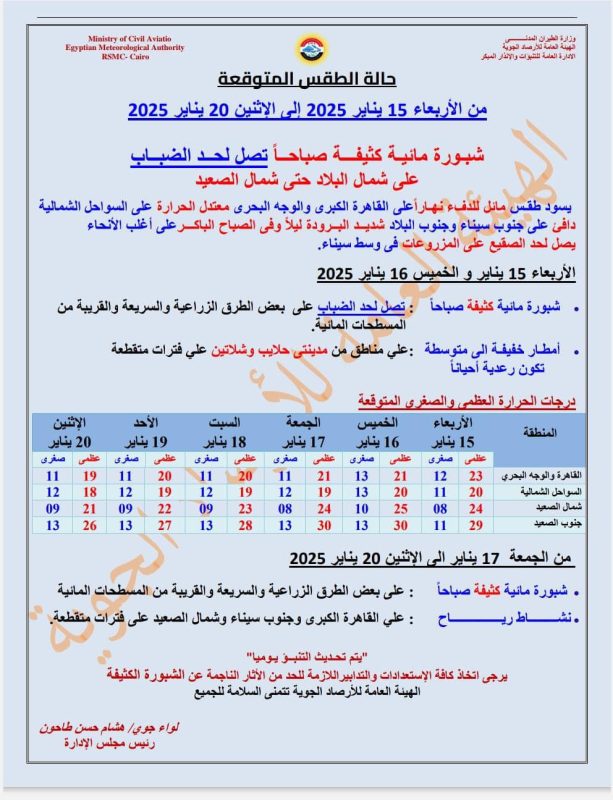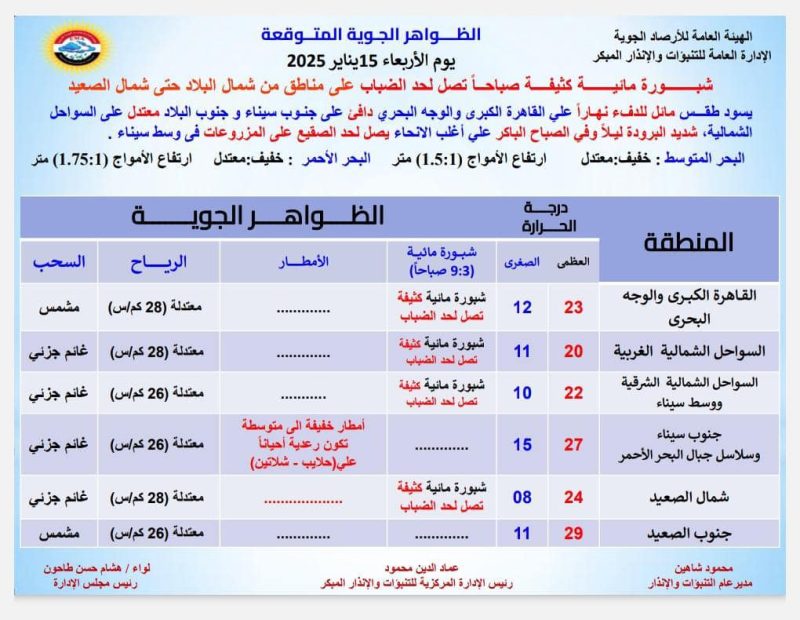 وعن الظواهر الجوية تتكون شبورة مائية كثيفة صباحا تصل لحد الضباب على بعض الطرق الزراعية والسريعة والقريبة من المسطحات المائية، وفرصة لسقوط أمطار خفيفة إلى متوسطة تكون رعدية أحيانا على مدينتي حلايب وشلاتين على فطرات متقطعة.