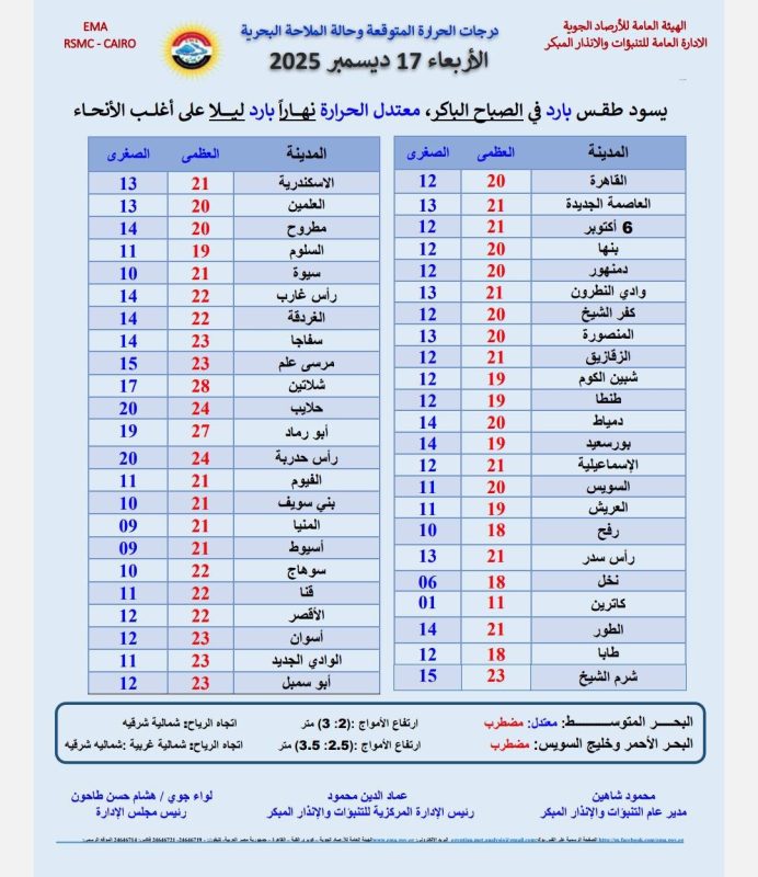 وفيما يلي بيان بدرجات الحرارة المتوقعة اليوم على محافظات ومدن مصر: