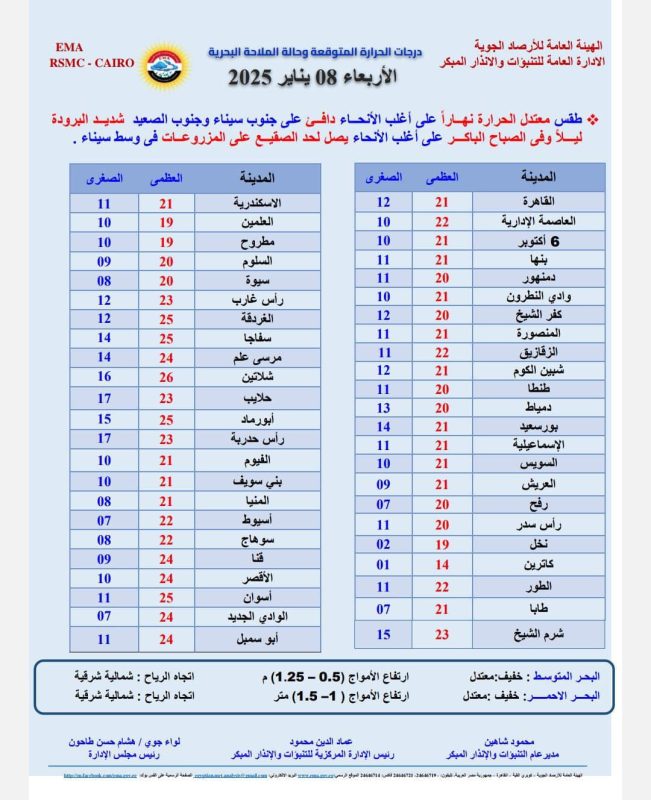 تتوقع هيئة الأرصاد الجوية أن يسود، اليوم الأربعاء، طقس معتدل الحرارة نهارا على القاهرة الكبرى والوجه البحري والسواحل الشمالية وشمال الصعيد, دافئ على جنوب سيناء وجنوب الصعيد.. بينما يسود طقس شديد البرودة ليلا وفي الصباح الباكر على أغلب الأنحاء يصل إلى حد الصقيع على المزروعات في وسط سيناء.