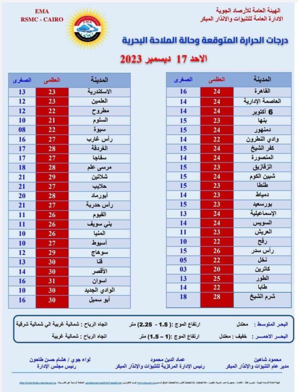 وقالت الأرصاد الجوية إن حركة الملاحة البحرية على البحر المتوسط معتدلة حيث يتراوح ارتفاع الأمواج بين 1 إلي 1.5 متر، وبالنسبة للبحر الأحمر فهي خفيفة وارتفاع الأمواج بين 0,5 إلي متر