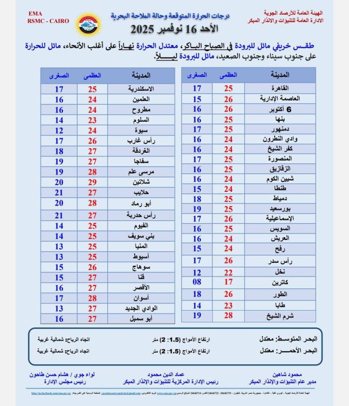 وفيما بيان بدرجات الحرارة المتوقعة، اليوم على مدن ومحافظات مصر: