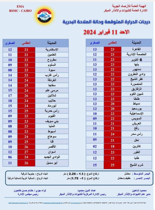 ومن المتوقع أن تسجل العظمى على القاهرة الكبرى اليوم 23 درجة مئوية.
