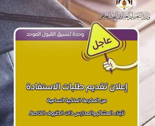 تعلن اللجنة العليا للمكرمة الملكية السـامية لأبناء العشائر في مـدارس البـادية الأردنية والمدارس ذات الظـروف الخاصة في وزارة التعليم العالي والبحث العلمي عن بدء تقديم طلبات الاستفادة من المكرمة الملكية السامية اعتباراً من صباح يوم الأحد الموافق 28 / 8 / 2022 وحتى الساعة الثانيـة عشرة ليلاً من يوم الخميس الموافق 1 / 9 / 2022 علماً بأن تقديم طلب الاستفادة من هذه المكرمة سيكون إلكترونياً من خلال الموقع الالكتروني لوحدة تنسيق القبول الموحد، ويتم دفع رسم طلب الاستفادة من هذه المكرمة باستخدام آلية الدفع الالكتروني عن طريق “خدمة تسديد الفواتير من البنك المركزي الأردني” إي-فواتيركم (eFAWATEERcom)، وذلك بعد تثبيت طلب الاستفادة من هذه المكرمة.