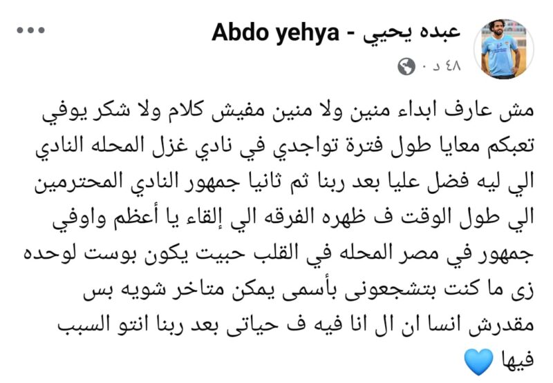 “مش عارف أبدأ منين ولا منين، مفيش كلام ولا شكر يوفي تعبكم معايا طول فترة تواجدي في نادي غزل المحلة، النادي اللي ليه فضل عليا بعد ربنا، ثم جمهور النادي المحترمين اللي كانوا دايمًا في ضهر الفريق.. المحلة في القلب. يمكن متأخرة شوية بس مقدرش أنسى إن اللي أنا فيه دلوقتي بعد ربنا أنتوا السبب فيه 💙”.