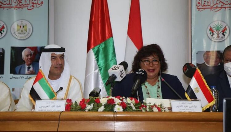 وقال العويس ان البهجة والسعادة تتجدّد باللقاءات الأخوية وتتعزّز أواصر المحبة، عندما تكتمل عناصرها التي يتوّجها التواصل العربي والتعاون المشترك وهذا ما يجسّده عمق العلاقات التاريخية بين دولة الإمارات العربية المتحدة وجمهورية مصر العربية، في ظل قيادة رشيدة تؤمن بأهمية استمرار التواصل العربي في المجالات كافة، وتابع اننا اليوم نمثّل معا نموذجا لهذه المبادئ من خلال ملتقى الشارقة للتكريم الثقافي، وهو الملتقى الذي انطلق هذا العام، والذي يهدف إلى تكريم القامات الثقافية العربية التي أثْرت الساحة الثقافية المعاصرة بالإبداع في مجال الآداب بحقولها المتعدّدة ، وأضاف لقد حرص الملتقى أن يتخذ من مصر مبتدأً لانطلاق فعالياته، ومنها إلى الدول العربية كافة، حيث شهدت مدينة دمنهور في أبريل الماضي تكريم ابنها سيّد إمام، خلال الدورة الأولى، وبعد أن جاب الملتقى الدول العربية، نعود اليوم بتوجيهٍ كريم من صاحب السمو الشيخ الدكتور سلطان بن محمد القاسمي عضو المجلس الأعلى حاكم الشارقة “راعي الملتقى”، لتكريم كوكبة جديدة من أدباء مصر، حيث تجتمع في هذا الحفل الإسكندرية ، وكفر الشيخ، والمنيا وأسيوط لتكريم الأدباء درويش الأسيوطي، مصطفى نصر، سمير المنزلاوي، سعيد نوح ، وتابع أتشرف في هذا المقام بأن أنقل إليكم تهنئة صاحب السمو حاكم الشارقة، على هذا التكريم، تقديراً لجهودكم وعطاءاتكم المخلصة كما أتشرف بأن أنقل لكم جميعاً تحياته وتمنياته لكم بالنجاح والتوفيق وأعرب عن شكره وتقديره للدكتورة إيناس عبدالدايم وزيرة الثقافة وإلى أعضاء فريق العمل، على تعاونهم المثمر لتنظيم الحفل .