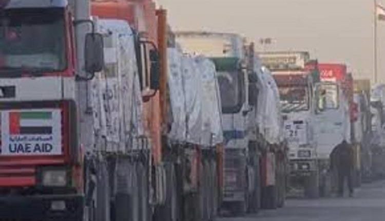 عبور 21 شاحنة مساعدات إماراتية ضمن القافلة الـ 15 للفلسطينيين بقطاع غزة