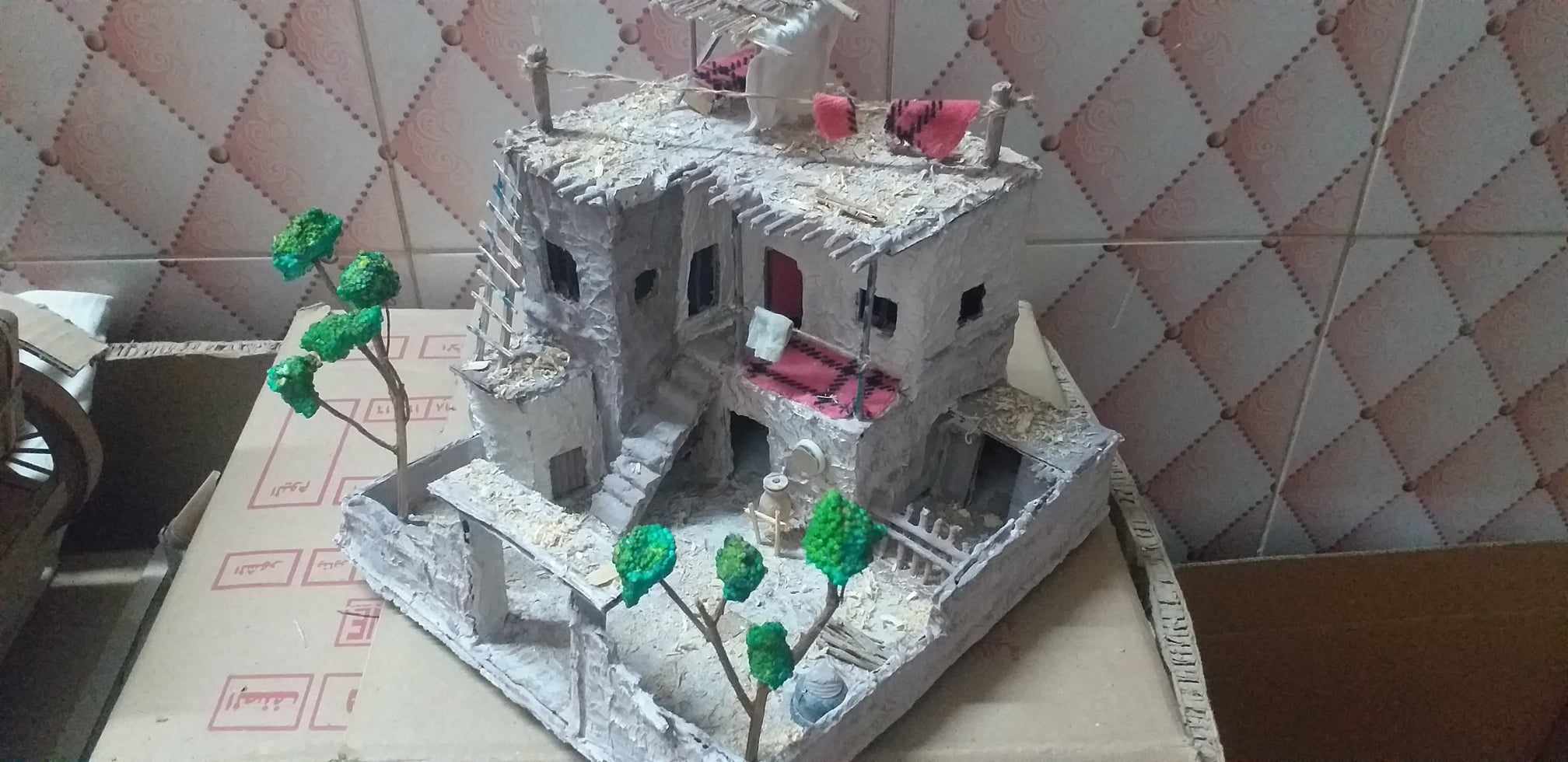 واستخدام اكسسوارت والزراير واي خامات تناسب العمل وقمت بتصميم قرية ريفيه وبيت ريفي بكل تفاصيله من الكرتون يعتبر قطعة فنيه فريده من نوعها