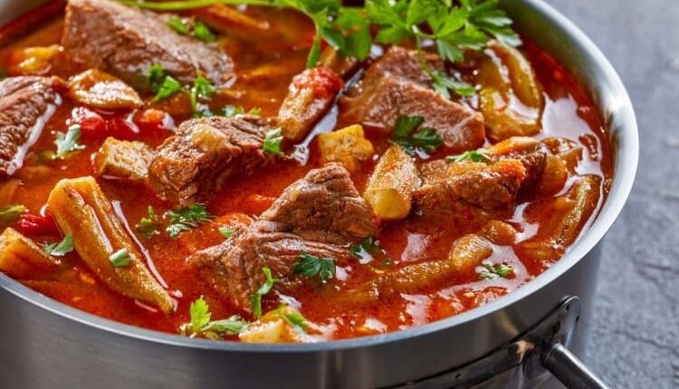بعد أن تمتزج المكونات الموجودة في إناء الطهي معاً نضع اللحم المسلوق في الإناء.