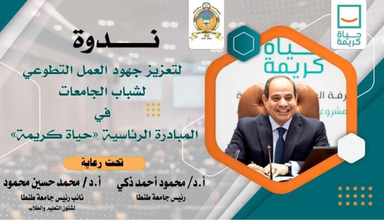 تستضيف جامعة طنطا يوم الاثنين الموافق 27 فبراير ممثلي مؤسسة حياة كريمة في ندوة توعوية طلابية لتعزيز جهود العمل التطوعي لشباب الجامعات في المبادرة الرئاسية “حياة كريمة”، بكليات الزراعة والصيدلة والتمريض ” تحت رعاية الدكتور محمود ذكي رئيس الجامعة، والدكتور محمد حسين نائب رئيس الجامعة لشئون التعليم والطلاب.