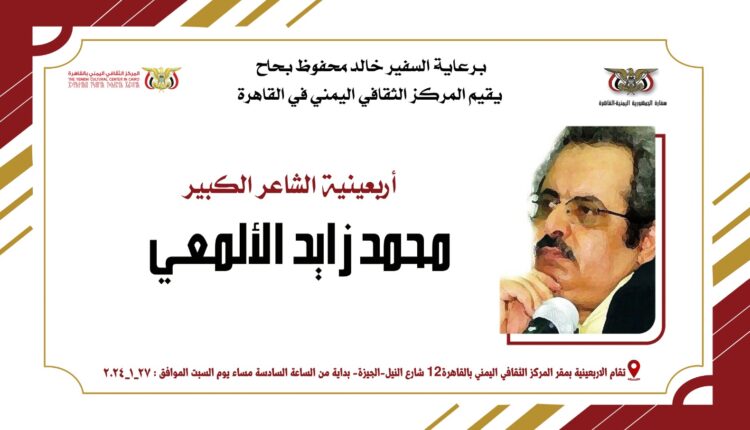 يقيم المركز الثقافي اليمني في القاهرة برعاية السفير خالد محفوظ بحاح، مساء يوم غد السبت أربعينية الشاعر السعودي الكبير محمد زايد الألمعي، الذي وافته المنية في القاهرة يوم ١٧ من ديسمبر الماضي بشكل مفاجئ.