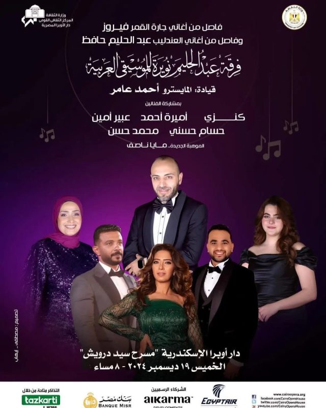 من المقرر أن تحيى غدا فرقة عبد الحليم نويرة للموسيقى العربية بقيادة المايسترو أحمد عامر حفلاً غنائيًا وذلك فى الثامنة مساء الخميس ١٩ ديسمبر على مسرح سيد درويش أوبرا الأسكندرية