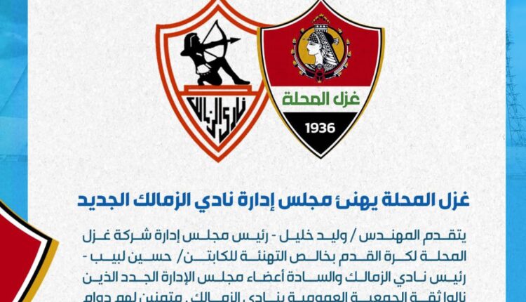 يتقدم المهندس / وليد خليل – رئيس مجلس إدارة شركة غزل المحلة لكرة القدم بخالص التهنئة للكابتـن/ حسين لبيب – رئيس نادي الزمالك والسـادة أعضاء مجلس الإدارة الجدد الذين نالوا ثقـة الجمعيـة العموميـة بنـادي الزمـالك , متمنين لهم دوام النجاح والتوفيق.