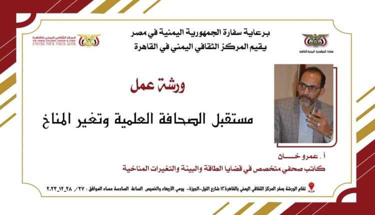 فتح المركز الثقافي اليمني في القاهرة باب التسجيل والتقديم للمشاركة في ورشة عمل مستقبل الصحافة العلمية وتغير المناخ، وعلاقة تمدد ظاهرة الجفاف في مصر واليمن، التي تقام في مقر المركز في القاهرة، على مدى يومي الأربعاء والخميس القادم ٢٧-٢٨ الشهر الجاري، برعاية سعادة السفير المهندس خالد محفوظ بحاح.