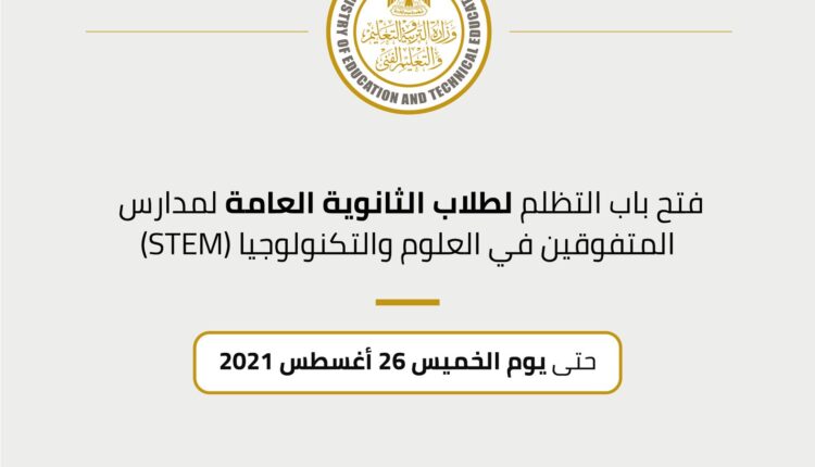 قررت وزارة التربية والتعليم والتعليم الفني فتح باب التظلم لطلاب الثانوية العامة لمدارس المتفوقين في العلوم والتكنولوجيا STEM للعام الدراسي الحالي ٢٠٢٠/٢٠٢١ علي النحو التالي: