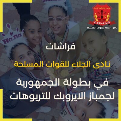 ويتقدم نادى الجلاء للقوات المسلحة بقيادة العميد وائل الناظر بالتهانى لفراشات الجمباز لتحقيق المركز الاول لجميع المشاركات المتفوقات في بطولة الجمهورية لجمباز الايروبك