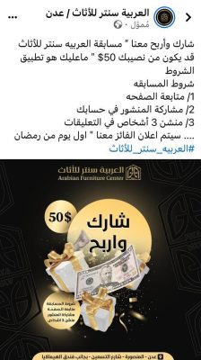 أثار رجل الأعمال جهاد الشوذبي، صهر رئيس المجلس الانتقالي الجنوبي عيدروس الزبيدي، سخط واسع على مواقع التواصل الإجتماعي بعد إعلانه عن مسابقة “غير لائقة” على صفحة مركز العربية سنتر للأثاث، الذي يملكه.