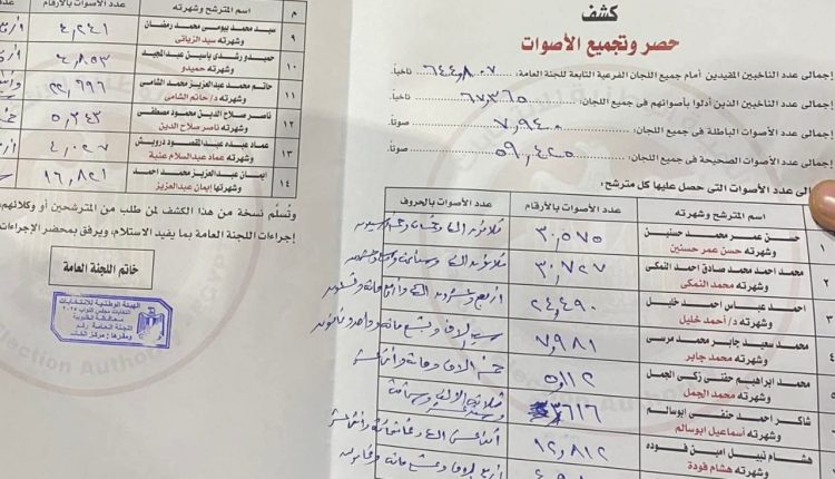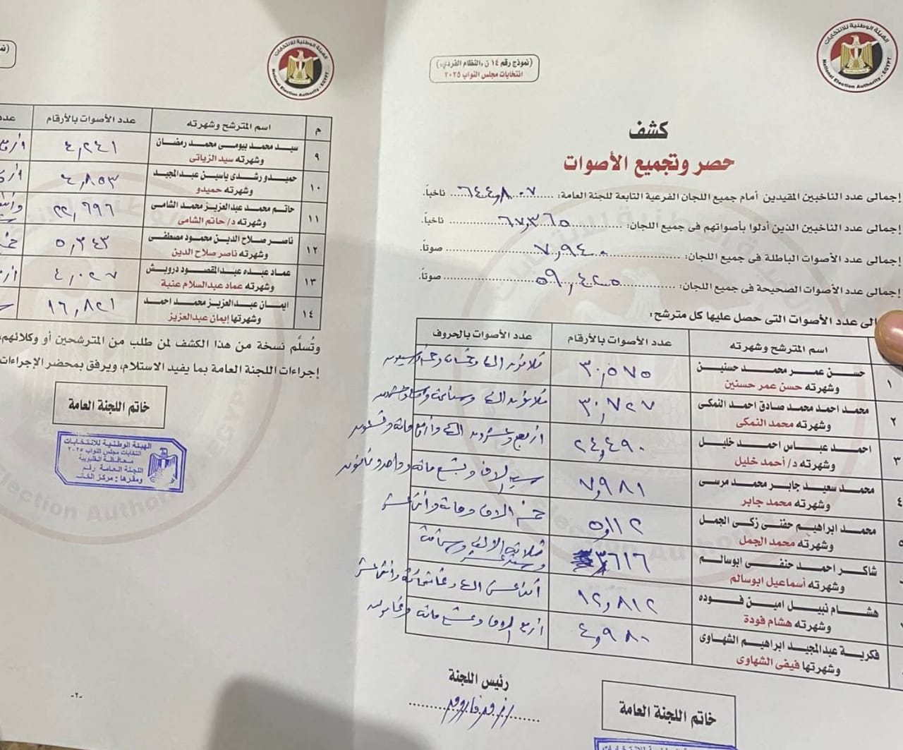 وقد أعلنت اللجنه أن عدد الناخبين من لهم حق الإدلاء بأصواتهم أمام جميع اللجان الفرعيه والتابعه للجنه العامه 644807 صوت ، وعدد الناخبين الذين أدلوا بأصواتهم في جميع اللجان الفرعية 67365 صوت ، وإجمالي عدد الاصوات الصحيحة 59425 صوت ، بينما عدد الاصوات الباطلة 7940 صوت ، وقد حصل المرشح محمد النمكى 30727 صوت ، والمرشح حسن عمر حسانين على 30575 صوت ، والمرشح احمد خليل على 24490صوت ، وحاتم الشامى على 22696 صوت ، وبهذه النتيجة فقد أعلنت اللجنه فوز كلا من محمد النمكى ، وحسن عمر حسانين ، بينما تجرى الاعاده بين كلا احمد خليل ،وحاتم الشامى يومى 17 و 18 ديسمبر المقبل .