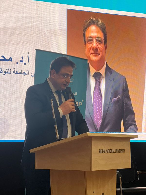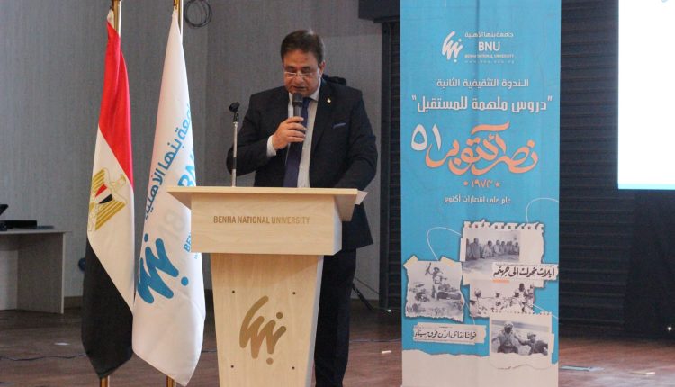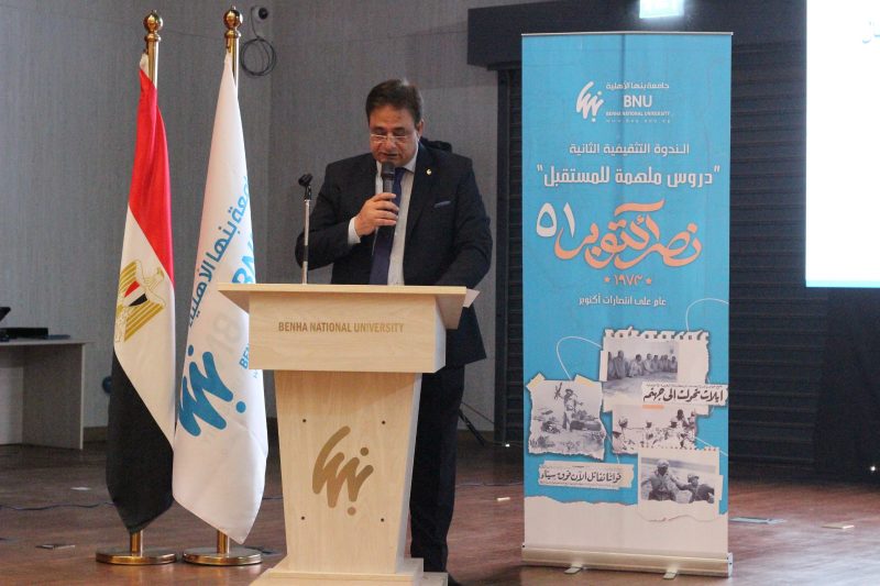 نظمت جامعة جامعة بنها الأهلية الندوة التثقيفية الثانية “51 ” عام على انتصارات أكتوبر دروس ملهمة للمستقبل” وذلك فى ذكرى ذكرى انتصار اكتوبر بمسرح الجامعة وذلك بحضور المهندس ايمن عطية محافظ القليوبيةواللواء اركان حرب اسامة عبد الحميد داود قائد قوات الدفاع الشعبي والعسكري و الخبير الاستراتيجي والعسكري اللواء اركان حرب سمير فرج والدكتورة سهير شعراوي نائب رئيس مجلس أمناء جامعة بنها الأهلية الدكتور تامر سمير رئيس جامعة بنها الأهلية والدكتور محمود شكل نائب رئيس الجامعة للتوظيف والابتكار وريادة الأعمال و ممثلى بيت العائله المصرية من الازهر و الكنيسة و رؤساء جهاز العبو و نواب البرلمان و رئيس جمعية مستثمرى العبور و وكلاء الوزارة ومديرين المدريات