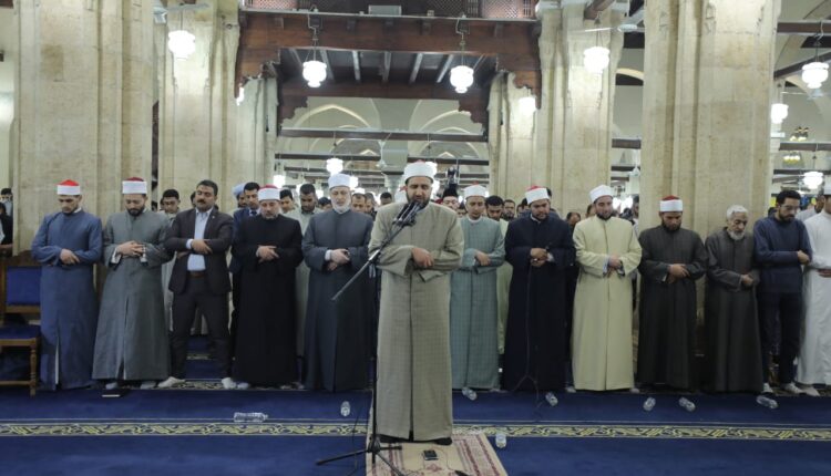 تقدم المصلين فضيلة الدكتور محمد الضويني ، وكيل الأزهر، والدكتور هاني عودة، مدير عام الجامع الأزهر، والشيخ حسن عبد النبي، وكيل لجنة مراجعة المصحف، ونخبة من علماء وقيادات الأزهر.