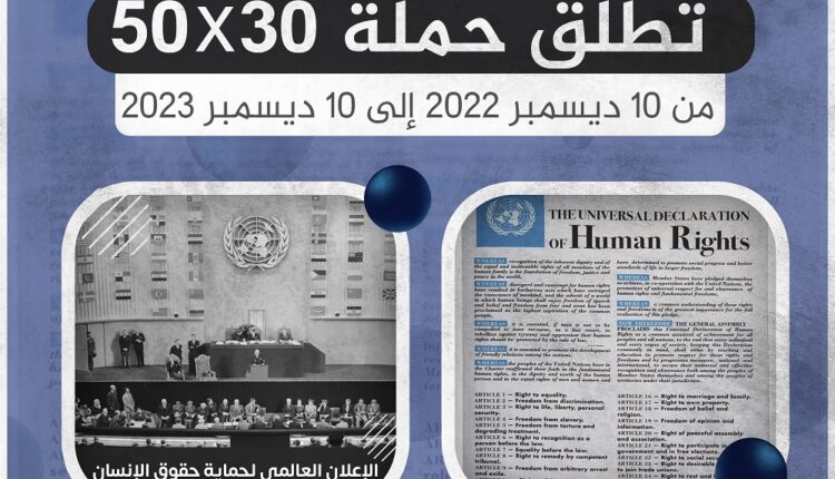 وتحتفل الأمم المتحدة بالذكرى السنوية الـ 75 لاعتماد الإعلان العالمي لحقوق الإنسان في 10 ديسمبر 2023، وبهذه المناسبة وتحضيراً لها تطلق مؤسسة ماعت للسلام والتنمية وحقوق الإنسان حملة 30 × 50 والتي تستمر لمدة عام بهدف التوعية بالإعلان العالمي لحقوق الإنسان وأهميته، حيث تسلط الحملة الضوء على الحقوق الواردة في الـ 30 مادة التي يتضمنها الإعلان العالمي خلال 50 أسبوع. وذلك إيماناً منا بدور منظمات المجتمع المدني بضرورة التوعية ونشر وتعزيز ثقافة حقوق الإنسان، حيث تأمل مؤسسة ماعت من خلال هذه الحملة في تعزيز المعرفة بالإعلان العالمي لحقوق الإنسان باعتباره مخططًا أساسيًا تسترشد به الإجراءات العملية الرامية إلى الدفاع عن حقوق الإنسان ومعالجة القضايا العالمية الملحّة في عالمنا اليوم.