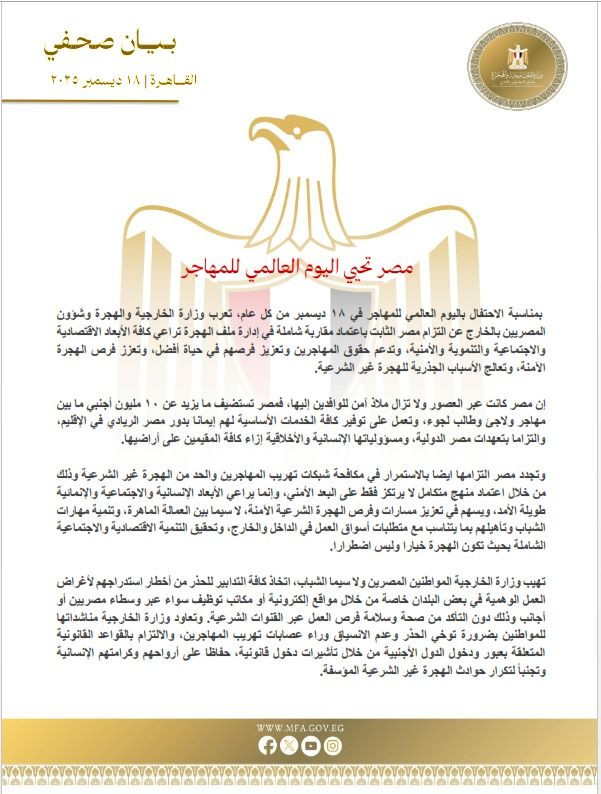 أعربت وزارة الخارجية والهجرة وشؤون المصريين بالخارج، عن التزام مصر الثابت باعتماد مقاربة شاملة في إدارة ملف الهجرة تراعي كافة الأبعاد الاقتصادية والاجتماعية والتنموية والأمنية، وتدعم حقوق المهاجرين وتعزيز فرصهم في حياة أفضل، وتعزز فرص الهجرة الآمنة، وتعالج الأسباب الجذرية للهجرة غير الشرعية.