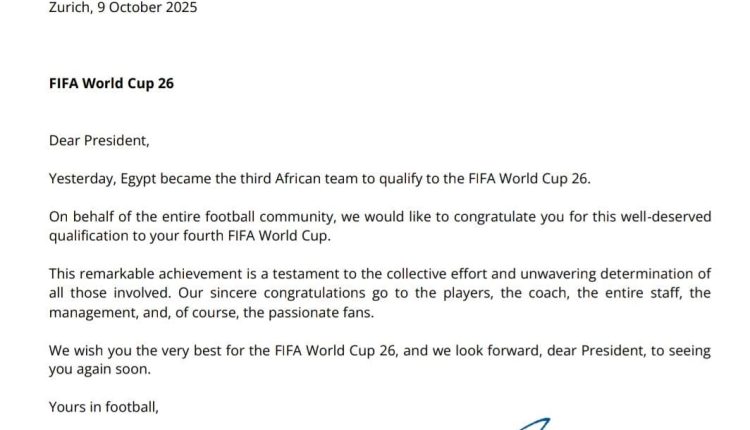 وأرسل رئيس فيفا خطاب تهنئة لأبو ريدة، احتفالا بتأهل الفراعنة لمنافسات كأس العالم 2026، كما شارك في التهنئة، ماتياس جرافستروم، السكرتير العام لفيفا.